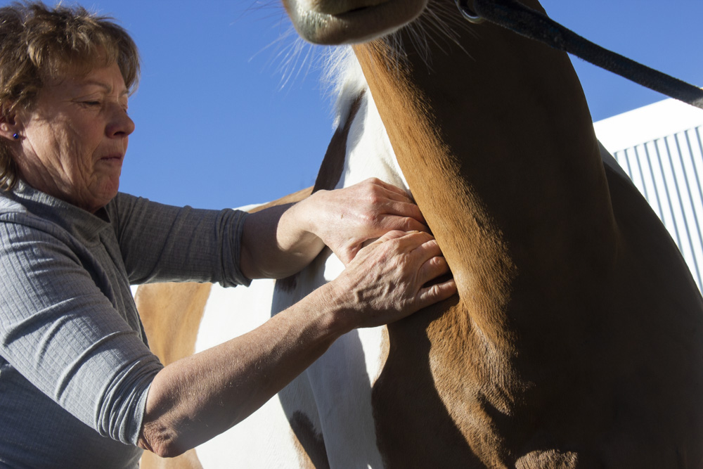 Following techniques based on the teachings of Jack Meagher. I have purchased his video and books, and find his teachings very easy to follow and very effective. I include many of these techniques in my one day horse owners “learn how to massage your horse” class